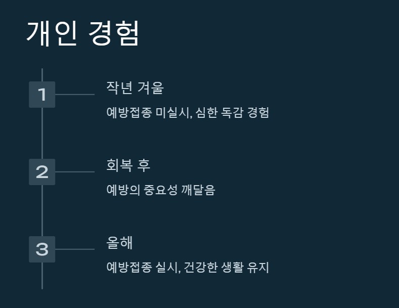 작년 겨울, 저는 독감 예방 접종을 하지 않아 심한 독감에 걸렸던 적이 있습니다. 당시 고열과 몸살로 인해 일주일간 누워 지내야 했습니다. 이로 인해 중요한 업무와 일정을 모두 놓쳤고, 회복 후에도 기력이 돌아오는 데 시간이 걸렸습니다. 이후 저는 예방 접종의 중요성을 절실히 깨달았고, 올해는 미리 백신을 맞았습니다. 예방 접종 후에도 건강한 생활 습관을 유지하며 겨울철을 보내고 있습니다. 이런 경험을 통해 예방의 중요성을 더욱 강조하고 싶습니다.
