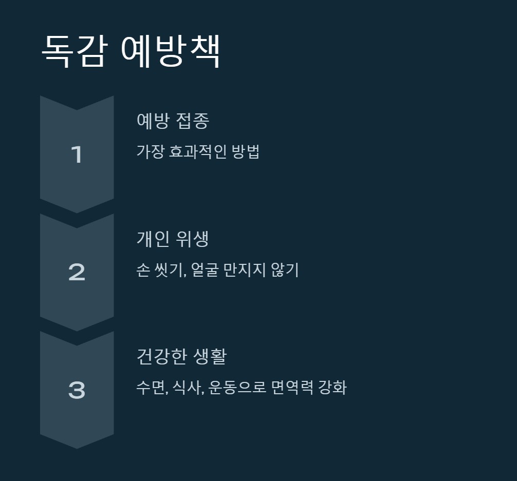 가장 효과적인 예방책은 독감 백신을 맞는 것입니다. 특히 어린이, 노인, 만성질환을 가진 사람들은 매년 예방 접종을 꼭 받는 것이 중요합니다. 예방 접종은 독감의 심각한 합병증을 줄이고, 주변 사람들에게 전파를 막는 데도 기여합니다.